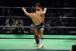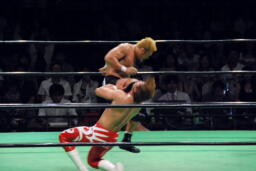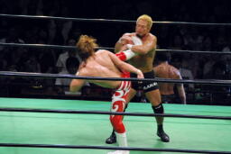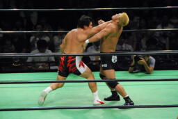 先発は杉浦と健介。ロックアップ、杉浦ヘッドロック、健介がロープに振ってショルダーブロックの打ち合い(右写真)。