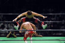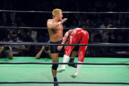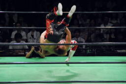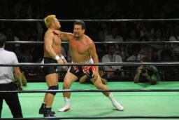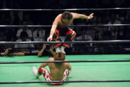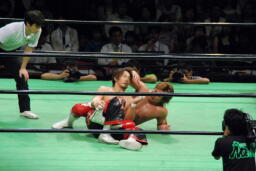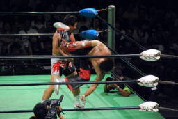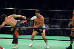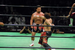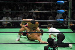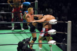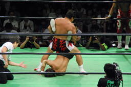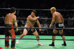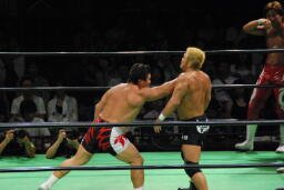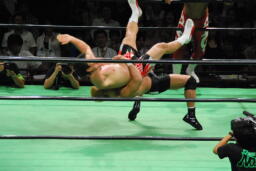 杉浦が抱え上げて丸藤がトラースキック(右写真)、サンドイッチキック。ブレーンバスターの体勢からトップロープに叩きつけ、キチンシンク、、カウント2。