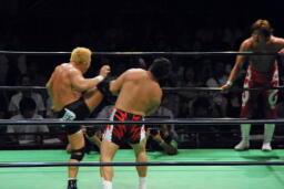 健介が後ろからラリアット、宮原トラースキック(右写真)、カバーは丸藤がカット。パワーボム狙いはブロックしてリバース。