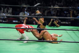 健介打ち勝つとブレーンバスター、カウント2。逆エビ固め(右写真)、丸藤ロープ。健介は宮原にタッチ。宮原ロープに振ってバックエルボー、カウント2。5分経過。