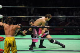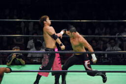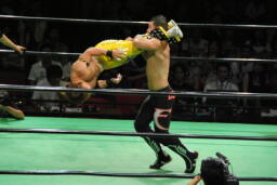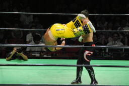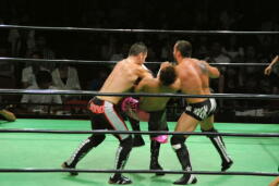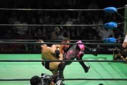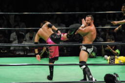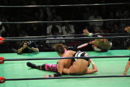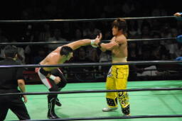 小峠ヘッドバットからDDT(左写真)、エドワーズ逆水平、カウント2。5分経過。