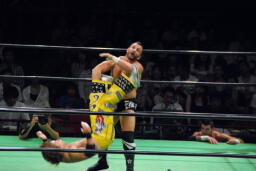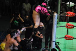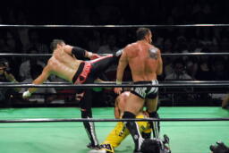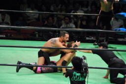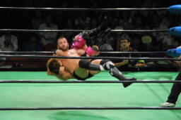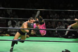 フィッシュ首投げからエプロンに出てトペ・アトミコ、カウント2。逆エビ固め、小峠ロープ。エドワーズ入ってロープに振ってダブルのバックエルボー(左写真)、カウント2。