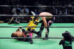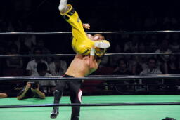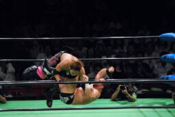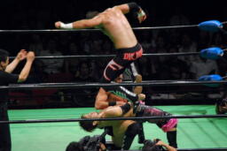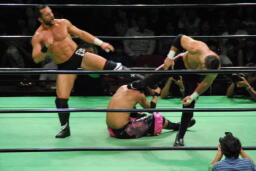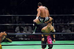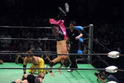 コーナーに振ってダブルニーアタック、ボディスラムからリバーススプラッシュ式フットスタンプ、カウント2。コーナーに上ってダイビングダブルニーアタック(左写真)、カウント2。