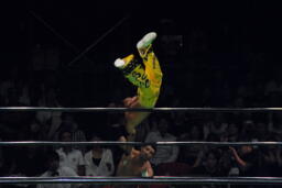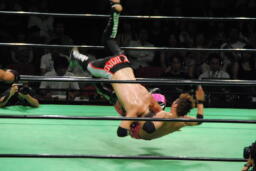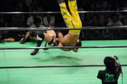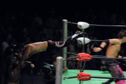 エドワーズロープに飛ぶ、石森リープフロッグでかわしコルバタ(左写真)、エドワーズ場外転落。石森は助走付けるが飛ぶ振りのみ。エドワーズリングに戻る。