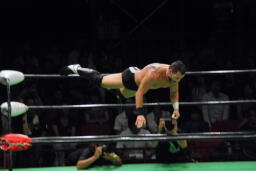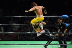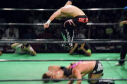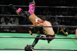 エドワーズロープに振る、小峠ブロックしてスイングDDT、石森にタッチ。石森フィッシュにドロップキック、エドワーズにハンドスプリングハイキック(右写真)