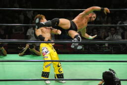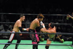 小峠が入るがエドワーズはバックハンドチョップで倒し、その上に石森をパワーボムで落とす(左写真)。フィッシュにタッチ。