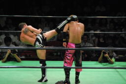 石森ロープに振る、フィッシュゼロ戦キック(右写真)。