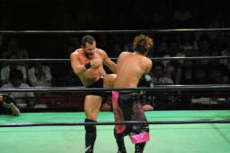 先発は石森とエドワーズ(右写真)。ロックアップ、エドワーズ腕を取る、石森切り返す、エドワーズも切り返す。エドワーズハンマーロックからヘッドロックに。石森ロープに振る、エドワーズショルダーブロック。