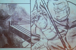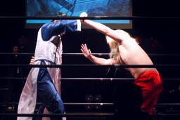 両者立ち上がる、ロープに振ってショルダーブロックの打ち合い(左写真)。