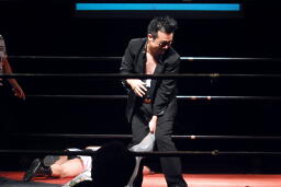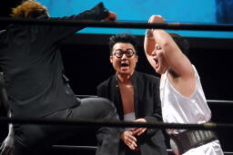 安敦が妨害しようとするが洋はガットショット(左写真)、ロープに振る、
