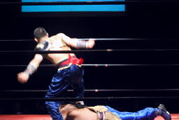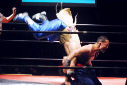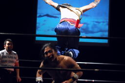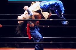 趙雲ソバット、トップロープに上って曹彰の背中にダブルフットスタンプ(左写真)。