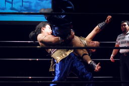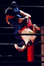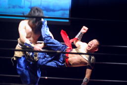 延髄蹴り(左写真)、曹彰ラリアット。