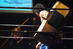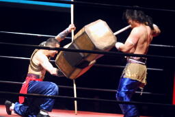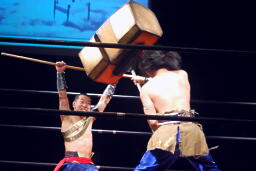 南側ひな壇に上って闘う二人。曹彰が趙雲を突き落とす(右写真)。曹彰鉄柱攻撃。