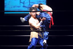 趙雲はボディにパンチ、曹彰それをキャッチするとダブルアームスープレックス(右写真)。