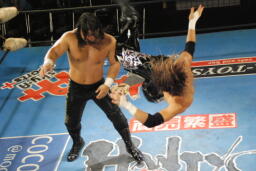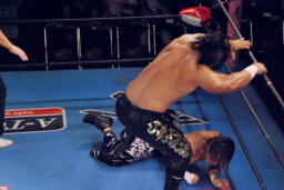 ストームフィッシャーマンバスターに行くがHAYATA着地、ロープに飛ぶ、ストームキャッチしてフラットライナー(左写真)、カウント2。