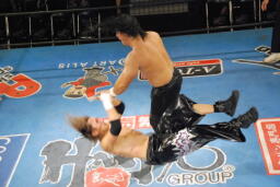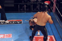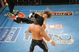 ストームバックハンドチョップ、ロープに振る、HAYATAブロックして延髄蹴り(右写真)。5分経過。