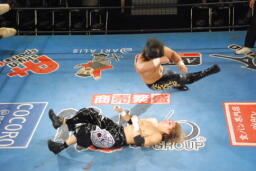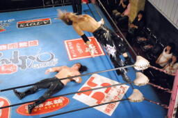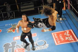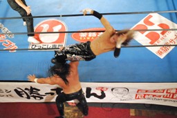 HAYATAコーナーに上ってミサイルキック(左写真)、カウント2。