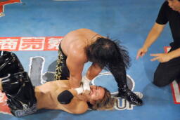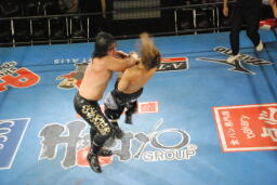 場外乱闘の末にカウント19でエプロンにHAYATAが戻る(右写真)、
