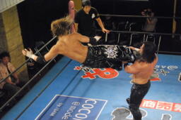 ストームロープに振ってラリアット、HAYATAかわしてドロップキック(右写真)で場外に落とす。