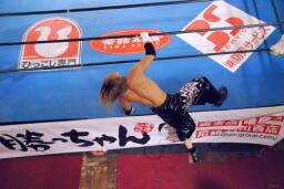 コーナーに上ってミサイルキック(右写真)、カウント2。