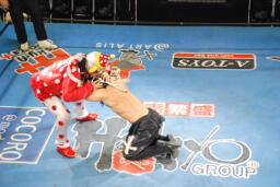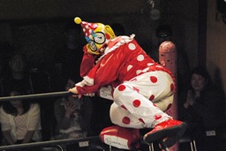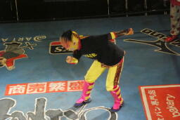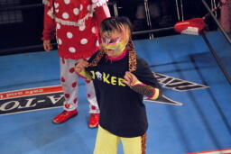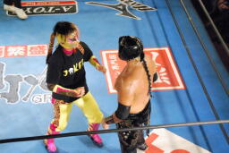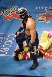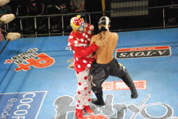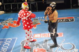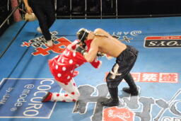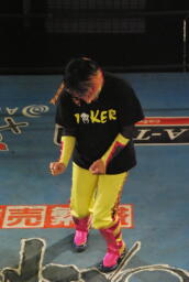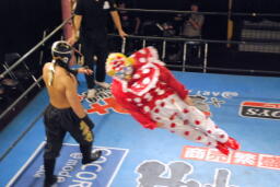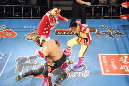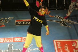 先に入場し、JOKERの入場テーマで踊る乱丸(右写真)。