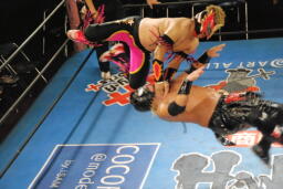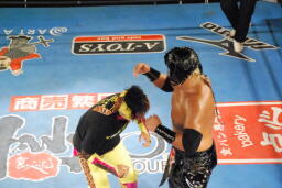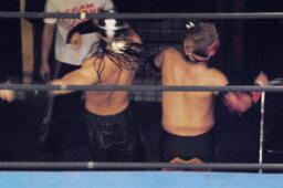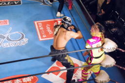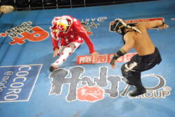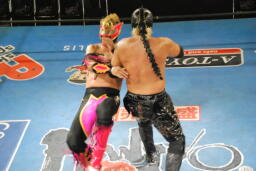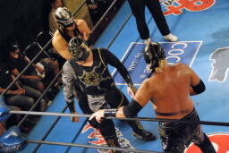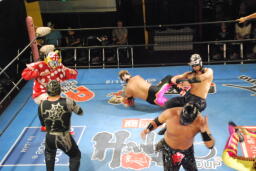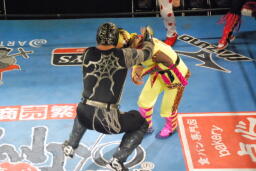 乱丸とスパイダー入り手四つ(左写真)、背後から空牙が攻撃、場外乱闘に。