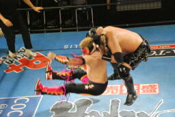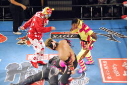 ユニーク軍団の2人も入って逆襲(右写真)、場外に落とす。