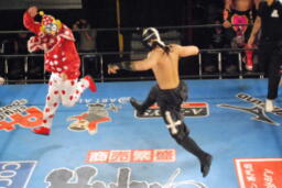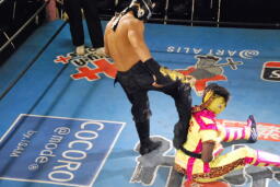 政宗リングに戻ると乱丸に首投げからサッカーボールキック(左写真)。