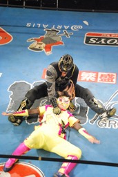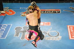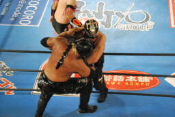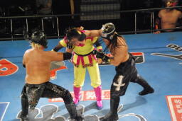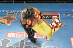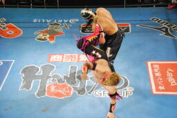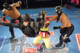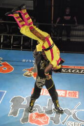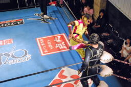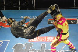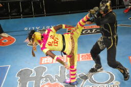 スパイダーバック取る、乱丸ブレークしてトラースキック(右写真)、カウント2。ミラクルマンにタッチ。