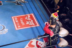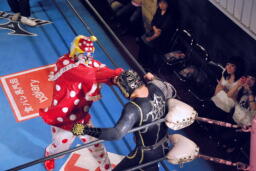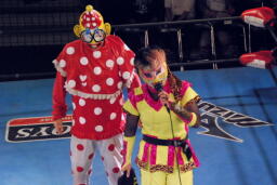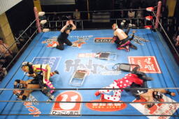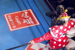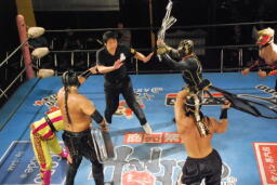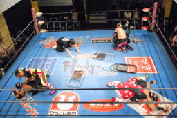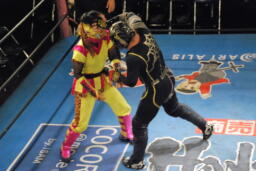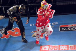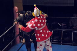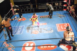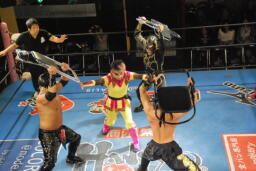 乱丸が術解除、JOKER辛うじて踏みとどまりレフェリーにイス攻撃の惨劇は回避(右写真)。