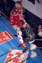 キャッチ延髄(左写真)。コーナーに上ってダイビングヘッドバット、カウント2。