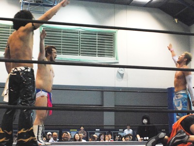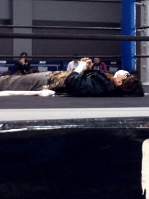 ようやくバンが到着し、選手はUPに。音響設備のセッティングもそこそこに40分遅れで試合開始。石井が矢野に完敗、明日も期待できないなあ。ほもクロはまたもやりたい放題。観戦記