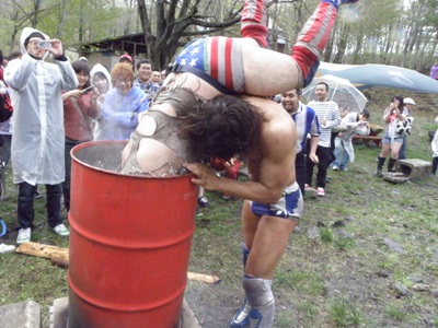 雲行きはかなり怪しい。雨ぽつぽつ。やっぱり降るのかあ。12時過ぎ、ようやくスタッフが迎えに来て400m先のプロレス会場に。中央に石が円形に並べられた場所が。ここがスタート地点らしい。四阿に受付と売店、バンガローが選手・スタッフ控室。12時50分に「迷子になった人がいる」とかで開始時刻を10分遅らせることが告げられる。しかしすぐに雨脚が強くなり、強風、雷も。さすがに雷は感電の可能性もあるということで開始予定時刻辺りで全員バンガローに避難。軽装備で山に来て天候の変化に耐えられないとはこの状態か。寒いのなんの。しかし避難して10分ほどで「雷雲は通り過ぎたので大丈夫」と避難命令解除。雨も上がっていた。