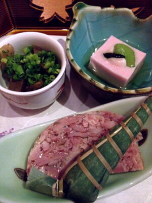 夕食はホテルにしようかとも思ったが、やはり近江牛が食いたい、ということで線路を越えて黒壁スクエアまで出、「橙」でステーキ御膳。まずは前菜。
