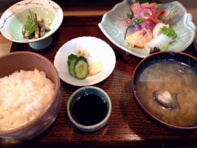 12時になったので昼飯。今日も肉にしようかと思ったが、前に行ったこともある「能登」を見つけたので入り、お造り定食にする。