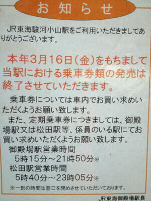 駿河小山駅はこの3月に切符の取り扱いをやめた、と。それは人減らしの手段なんだろうが、この駅は富士霊園の最寄り駅で結構休日にはお年寄りの乗り降りも多い。それをすべて車掌が対応するもんだから大変なことに(さらに風でお札が飛ばされる事故も発生)。3分遅れの9時52分に到着した電車は10分遅れの10時ちょうどに発車することに。本末転倒だな。