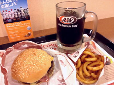 6時にホテルを出てゆいレールで6時半に空港着。予定通りA&Wでメルティリッチ、カーリーフライ(ポテトをねじって揚げた奴)とルートビアのセット。やはり一味違う。