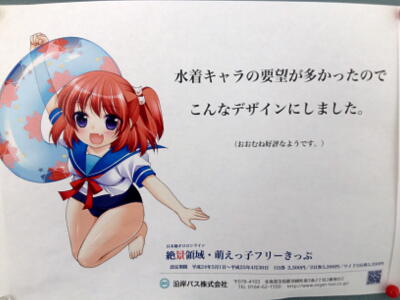 利尻島行けるかなー、と思ってたが、帰りの便が特急に間に合わないらしいので宗谷岬行きに切り替える。バスターミナルに貼ってあった沿岸バスの広告。なんでも「萌え」。