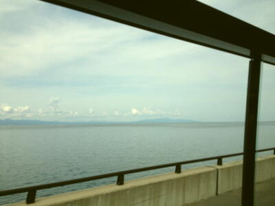 車窓(陸奥湾)の風景。約1時間で関係者用バスなので当然のことながら関係者駐車場に。アリス十番がぞろぞろとバンの中から出て来た。
