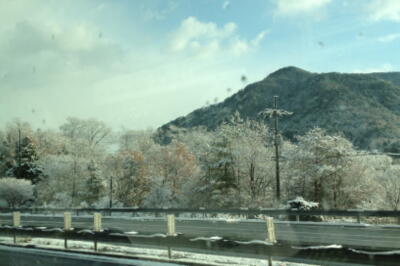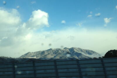 中国自動車道に入ると空も晴れ、遠くの山もうっすら雪景色。