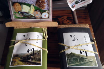 駅舎内で「かれい川弁当」は売ってた。この時間だと買えたか。左の緑のパッケージの新作は限定10食でもう売り切れてたが。
