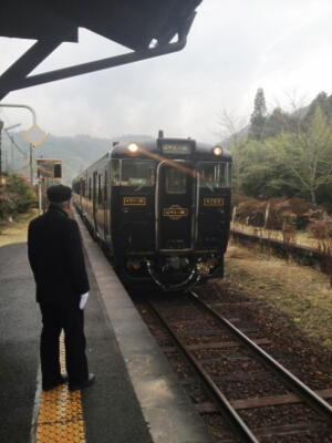 11時55分、下りはやとの風1号が入線。名誉駅長さんが迎える。