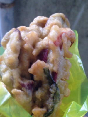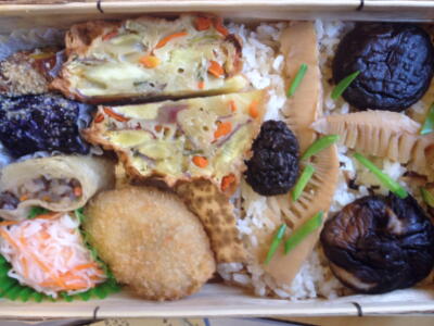 中身。コロッケ、ガネ、煮びたし、酢の物など材料はすべて野菜。やっと食えた。
