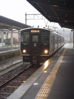 加治木駅に戻るとすっかりビショ濡れ状態。Suicaで入場、13時18分発の各駅に乗車。