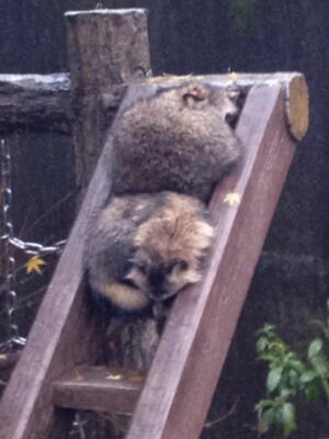 雨の中丸まって寝てるタヌキ2匹。
