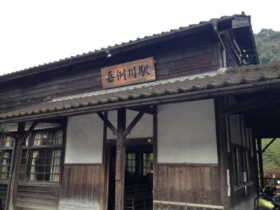 鹿児島空港を出るとすぐ目の前に来てたいわさきバスに乗り嘉例川駅に。バス停は駅より高台の新しくできたっぽい駐車場。観光駅なんだなあ。そこから200mほど遊歩道を歩くと駅に。空は晴れ。