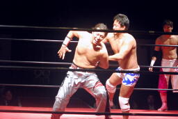 佐藤もエルボー返す(右写真)。小峠ヘッドバット、ロープに飛ぶ、トウナイが低空ドロップキック。