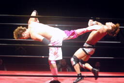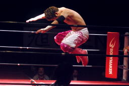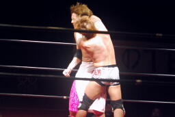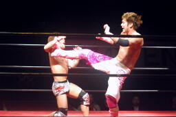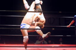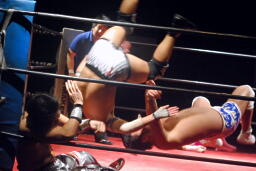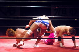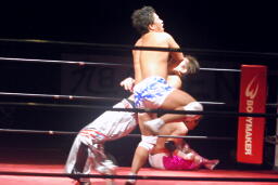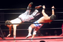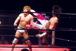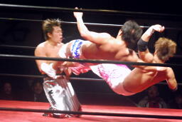 原田切り返してヘッドロックからフライングメイヤー、トウナイヘッドシザーズでブレーク。トウナイバック取る、原田切り返してエルボー、ロープに振ってヒップトス、ブロックされるとトウナイはドロップキック(右写真)。両軍タッチ。