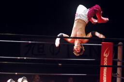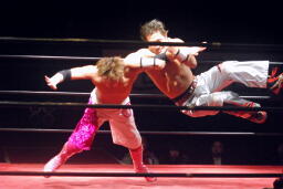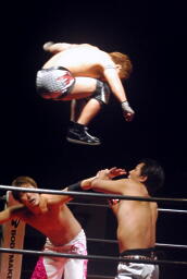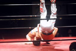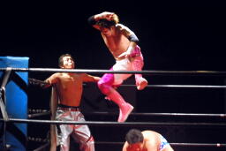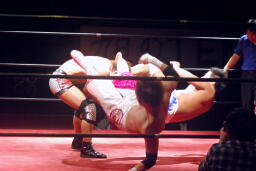 原田コーナーに振る、トウナイ切り返して突っ込む、原田ショルダースルーでエプロンに。トウナイはトップロープ越えでウラカンホイップ(右写真)、
