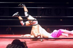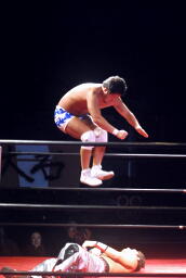 コーナーに上ってムーンサルトプレス(左写真)、カウント2。